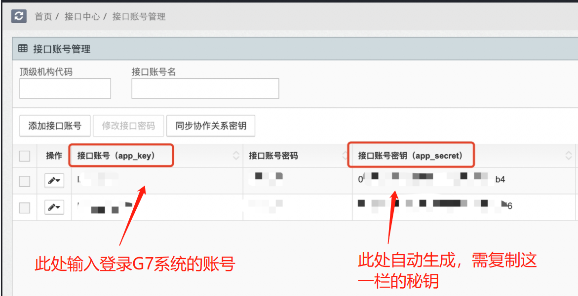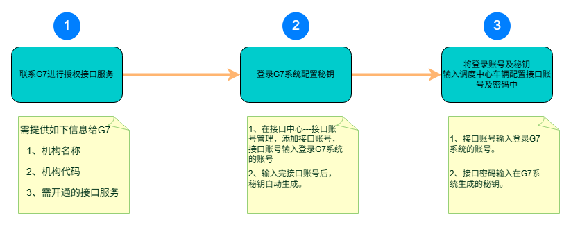## 配置流程  ## 操作步骤 ### 1. 联系G7授权开通接口服务 (1)需将机构名称、机构代码、开通的接口服务提供给G7技术人员。 所属机构名称:在G7系统可查看本公司在G7系统开户时的机构名称。 所属机构代码:在G7系统可查看本公司在G7系统开户时的机构代码。 所属机构名称和机构代码可在G7系统----用户中心—机构管理下面查看,如下图所示  (2)将需开通的接口服务名称提供给G7技术人员,提供以下截图给G7相关人员。  ### 2. 登录G7系统配置秘钥 (1)登录G7系统https://g7s.huoyunren.com/#api/user/index.html (2)打开页面“首页-接口中心-接口账号管理” (3)点“添加接口账号”按钮 (4)输入接口账号为“登录G7系统的登录账号” (5)输入接口账号后,接口秘钥自动生成,复制该秘钥  ### 3. 完成G7接口账号和密码的配置